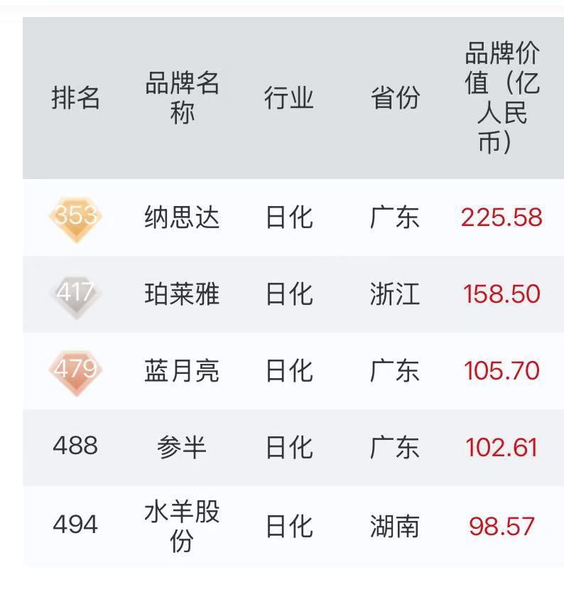 南方+记者注意到,按照其分类,日化仅有5家企业上榜,分别是纳思达、珀莱雅、蓝月亮、参半和水羊股份,品牌价值分别为225.58亿元、158.5亿元、105.7亿元、102.61亿元和98.57亿元。其中,参半口腔创立于2018年,定位提供精细化、全场景的一站式口腔护理解决方案,水羊股份则是以“自有品牌与CP品牌双业务驱动”的新消费品美妆品牌企业。