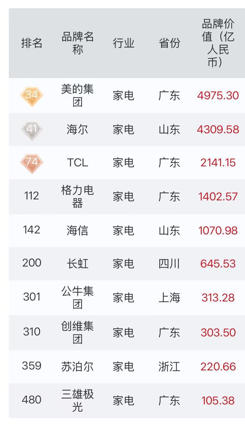 在家电榜单上,美的、海尔、TCL、格力电器、海信、长虹、公牛集团、创维集团、苏泊尔和三雄极光10家企业上榜。其中,三雄极光总部位于广州,致力提供整体照明解决方案和专业服务。